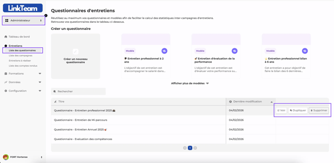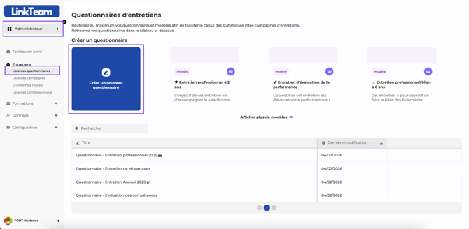 đĄ Exemple concret : Vous crĂ©ez une trame "Entretien Annuel 2026" avec toutes vos questions. Ensuite, vous lancez une campagne en janvier pour vĂ©hiculer cette trame Ă 150 collaborateurs. La mĂȘme trame peut ĂȘtre rĂ©utilisĂ©e en fĂ©vrier pour une nouvelle campagne avec de nouveaux collaborateurs.