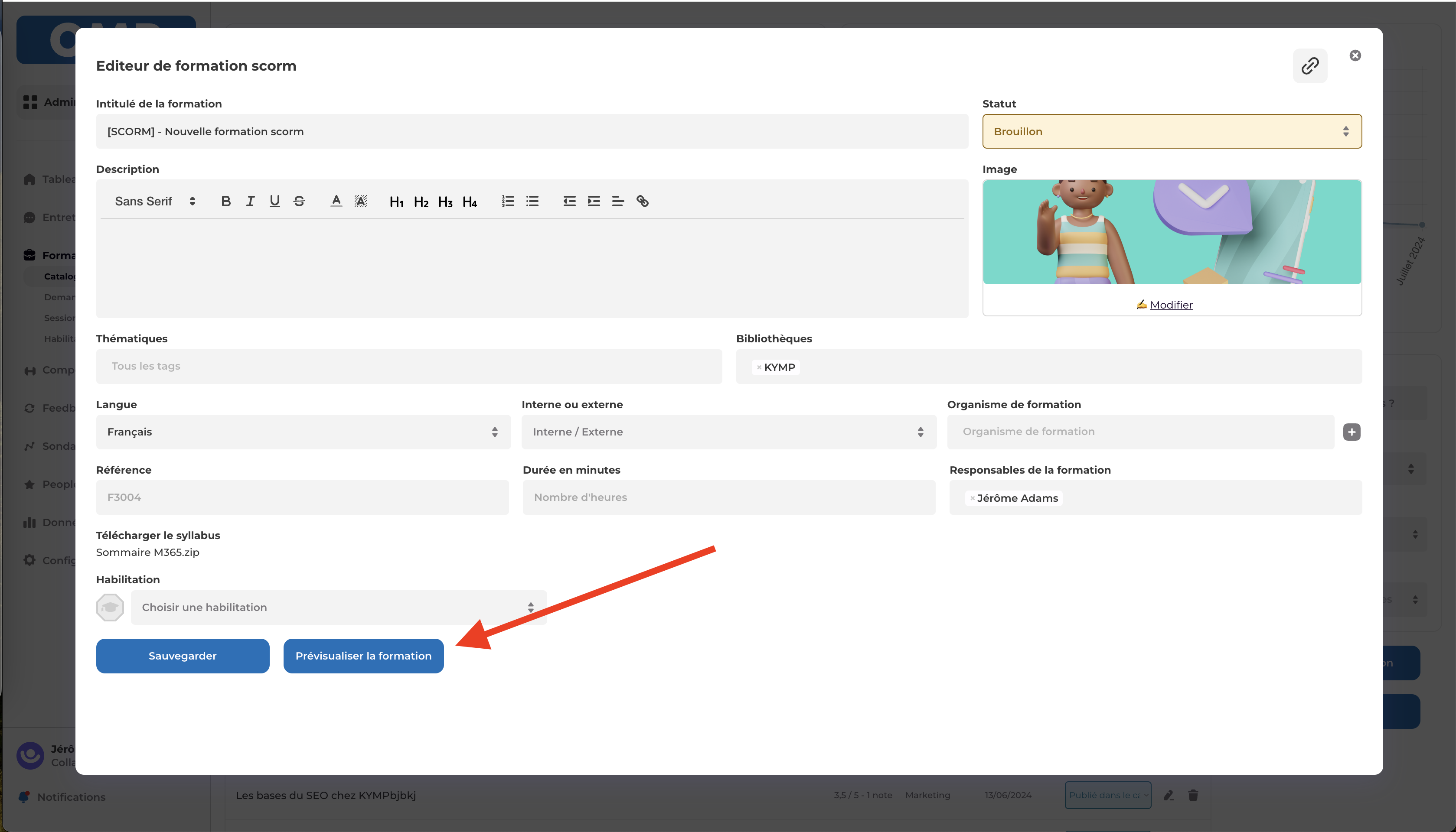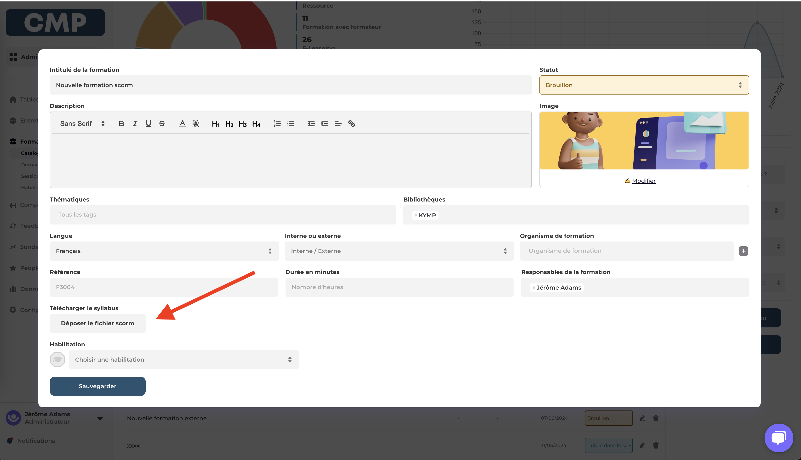 - Vous pouvez modifier les caractéristiques (titre, etc..) d’une formation scorm