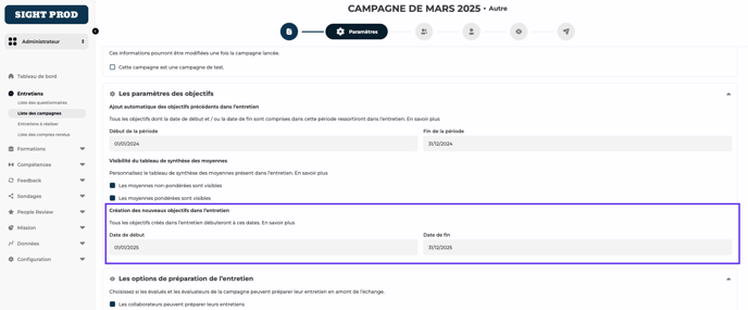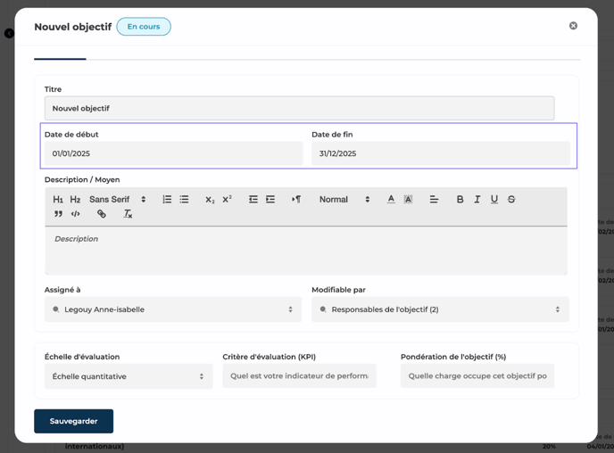Ainsi, tous les objectifs créés dans l'entretien débuteront et termineront aux dates que vous avez renseignées.