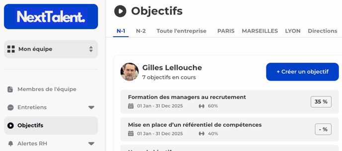 Vous pouvez définir les objectifs de vos collaborateurs, depuis votre espace Manager, dans l'onglet 'Objectifs', ou lors de leurs entretiens.