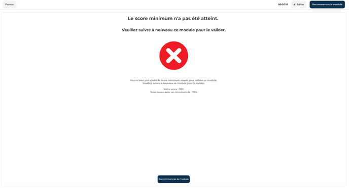 Si le score minimum n'est pas atteint, l'apprenant sera invité à refaire la formation jusqu'à ce qu'il atteigne le score.