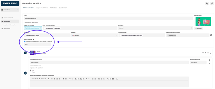 Sur la page d'édition d'un module, vous verrez un champ intitulé "Score minimum". Vous pourrez renseigner un score en % qui correspond au résultat que doit atteindre l'apprenant pour valider la formation.