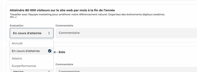 Il est tout à fait possible de configurer en amont des évaluations une échelle qui permettra à vos collaborateurs et managers de sélectionner un échelon défini par vos soins. Demander à votre CSM pour le parametrage de votre échelle qualitative