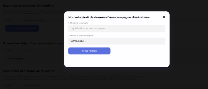Dans la partie “Export de campagnes d’entretiens”, sélectionnez une campagne pour laquelle vous souhaitez réalise l’export et définissez le nom de l’export.
