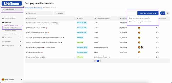 đĄ Exemple concret : Vous organisez les entretiens annuels 2026. Vous crĂ©ez une campagne manuelle "Entretiens annuels 2026 - SiĂšge" pour les 200 collaborateurs du siĂšge en janvier, puis une seconde campagne "Entretiens annuels 2026 - Agences" pour les 150 collaborateurs des agences en fĂ©vrier.