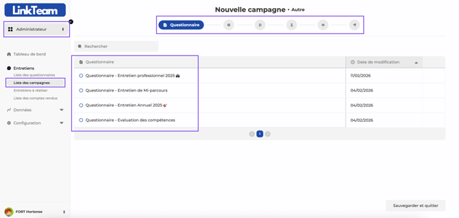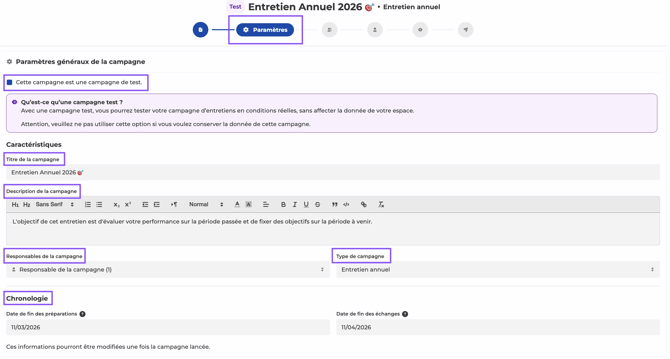 La campagne est le véhicule de diffusion de votre trame d'entretien auprÚs de votre population cible. C'est elle qui va générer les entretiens individuels pour chaque collaborateur concerné, attribuer les évaluateurs, fixer les échéances et orchestrer les notifications.