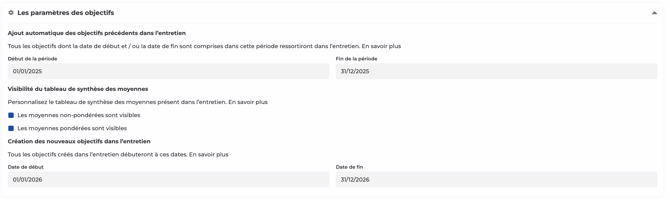 - Enfin, dĂ©finissez la pĂ©riode des nouveaux objectifs : les objectifs créés dans lâentretien reprendront par dĂ©faut les dates renseignĂ©es ici.