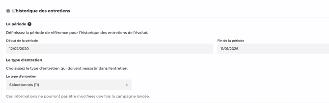 Historique dâentretien : comme pour les formations, sĂ©lectionnez une pĂ©riode pour afficher les entretiens rĂ©alisĂ©s. Vous pouvez Ă©galement choisir les types dâentretiens Ă faire remonter dans lâentretien.