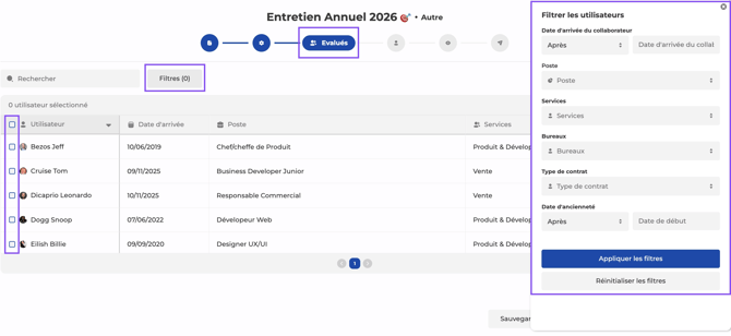 Utilisez les filtres pour sélectionner des groupes de collaborateurs.