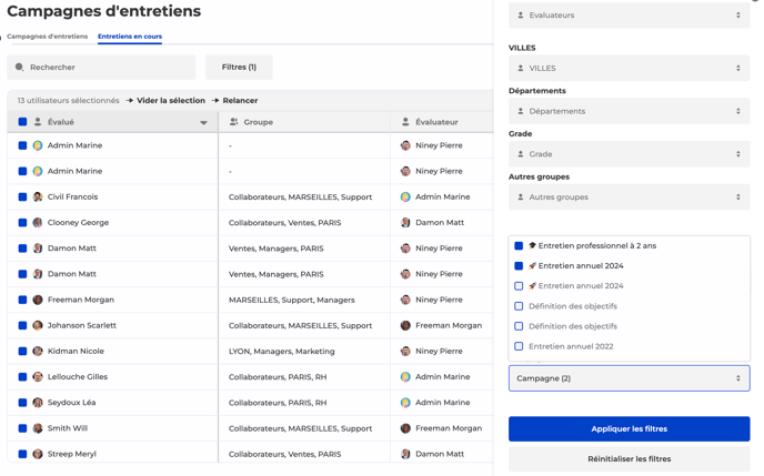 Depuis la page "Entretiens en cours" de l'onglet "Liste des campagnes", après avoir sélectionné les collaborateurs des campagnes souhaitées grâce aux filtres, vous trouverez un bouton "Relancer", qui vous permet de relancer les collaborateurs ayant une action en attente sur l’entretien (Les critères sont les mêmes que ceux de la capture d'écran précédente)