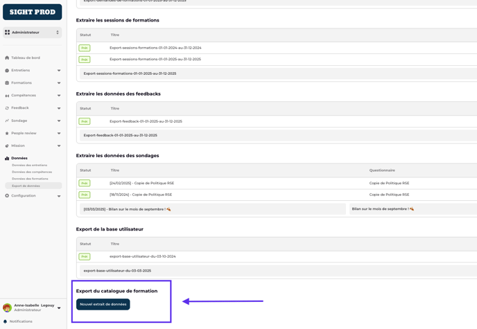 Pour ce faire, rendez-vous dans la partie Données > Export de données. Cliquez sur "Nouvel extrait de données" pour télécharger votre catalogue.