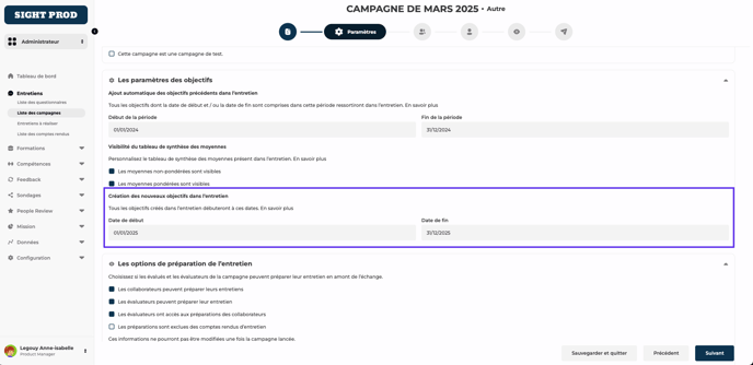 Vous pouvez désormais définir une date de début et une date de fin par défaut pour tous les objectifs créés dans une campagne d'entretiens. Faites gagner du temps à vos équipes et assurez-vous de l'uniformité des objectifs créés!