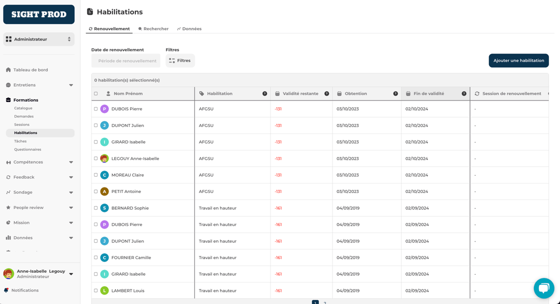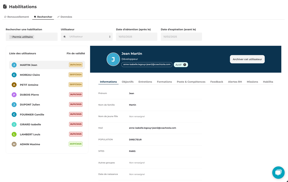 Obtenez la liste des collaborateurs qui ont l'habilitation que vous recherchez et visualisez en un coup d'oeil la validité de celle-ci.