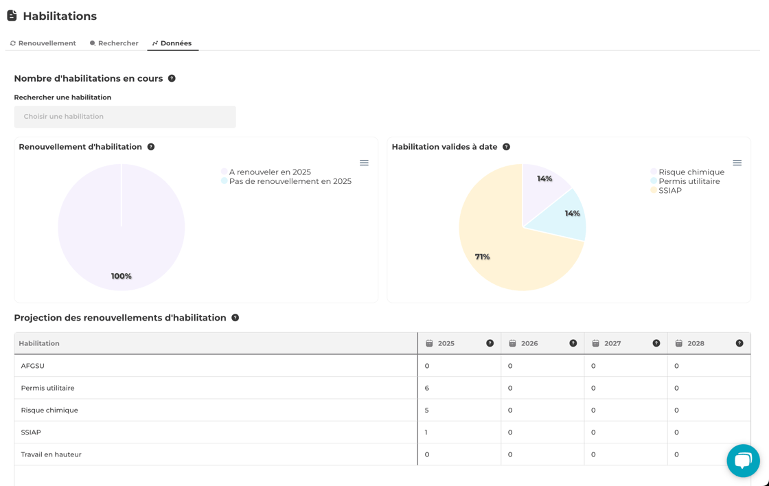 Visualisez les données de vos habilitations dans l'onglet "Données" : le taux d'habilitations à renouveler, le taux d'habilitations valides.