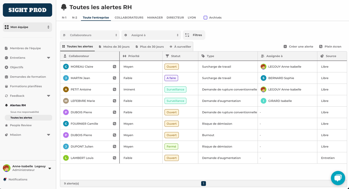 En tant qu'administrateur, retrouvez un onglet dédié à la visualisation de toutes les alertes RH remontées sur tous les entretiens, toutes équipes confondues!
