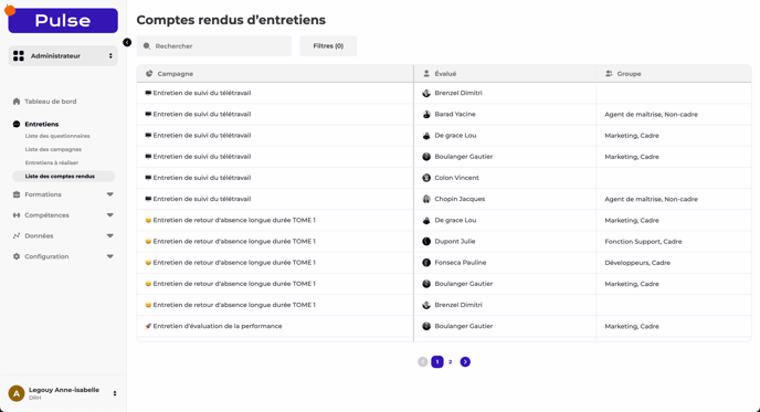 Dans l'onglet "Liste des comptes-rendus", vous retrouverez l'ensemble des entretiens terminés de toutes les campagnes en cours ou clôturées au sein de votre entreprise. Depuis cette page, vous pourrez les consulter et les télécharger au format PDF.
