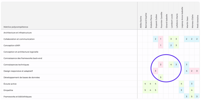La matrice polycompétence liste toutes les compétences de votre référentiel ainsi que les notes des dernières évaluations pour chacune, par collaborateur !