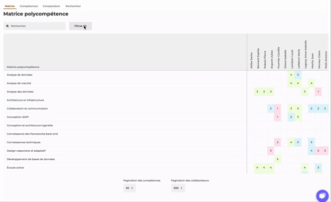 Nous avons mis en place un jeu de filtres complet qui vous permettra de granulariser vos recherches : par compétences, par groupes de compétences, par manager opérationnel, date d’arrivée du collaborateur, etc.