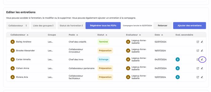 En tant qu’administrateur, vous devez cliquer sur l’icône “Modifier”, située tout à droite de la ligne de l’entretien - depuis la page de campagne ou la page des entretiens en cours.