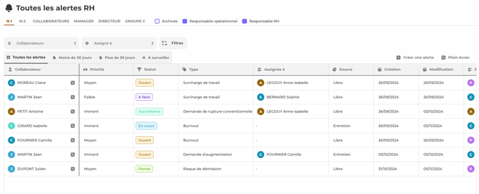 L'outil de pilotage des alertes RH permet de suivre les actions mises en place suite aux alertes remontées sur un collaborateur.
