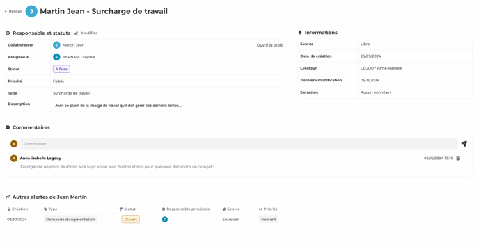 Le manager peut retrouver toutes les alertes RH qui ont été remontées dans l’entretien ou créées de manière libre, en fonction de son lien hiérarchique avec le collaborateur concerné.