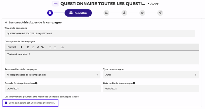 Choisir qu’une campagne sera un test se fait au moment du lancement de votre campagne à l’étape 2.