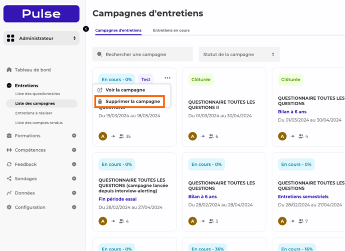Pour supprimer une campagne de test, rien de plus simple ! Il vous suffit de cliquer sur le menu “…” puis de sélectionner “Supprimer la campagne”.