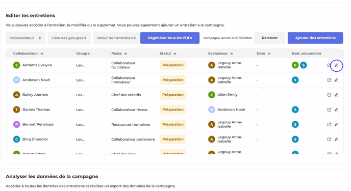 Vous pourrez modifier les évaluateurs une fois la campagne lancée. Pour cela, il vous suffit de cliquer sur l’icône “Modifier” située tout à droite de l’entretien - depuis la page de la campagne, ou la page des entretiens en cours.