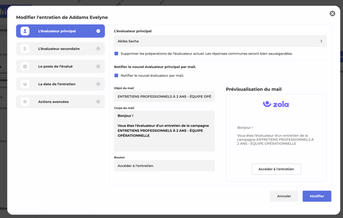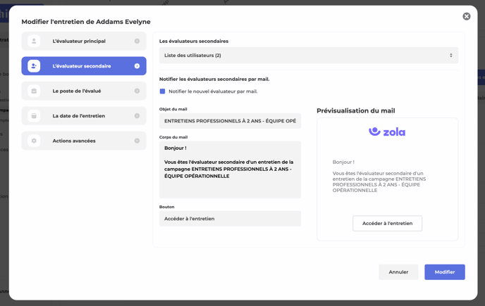 Si vous souhaitez modifier le ou les évaluateurs secondaires, vous pourrez sélectionner un ou plusieurs utilisateurs. Vous pouvez personnaliser le mail de notification qui leur sera adressé.